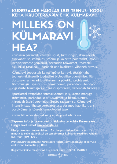 Kuressaare Haigla taastusravi osakonnas on nüüdsest võimalik kasutada uues Cryomed PRO külmakambris individuaalset terve keha külmaravi!