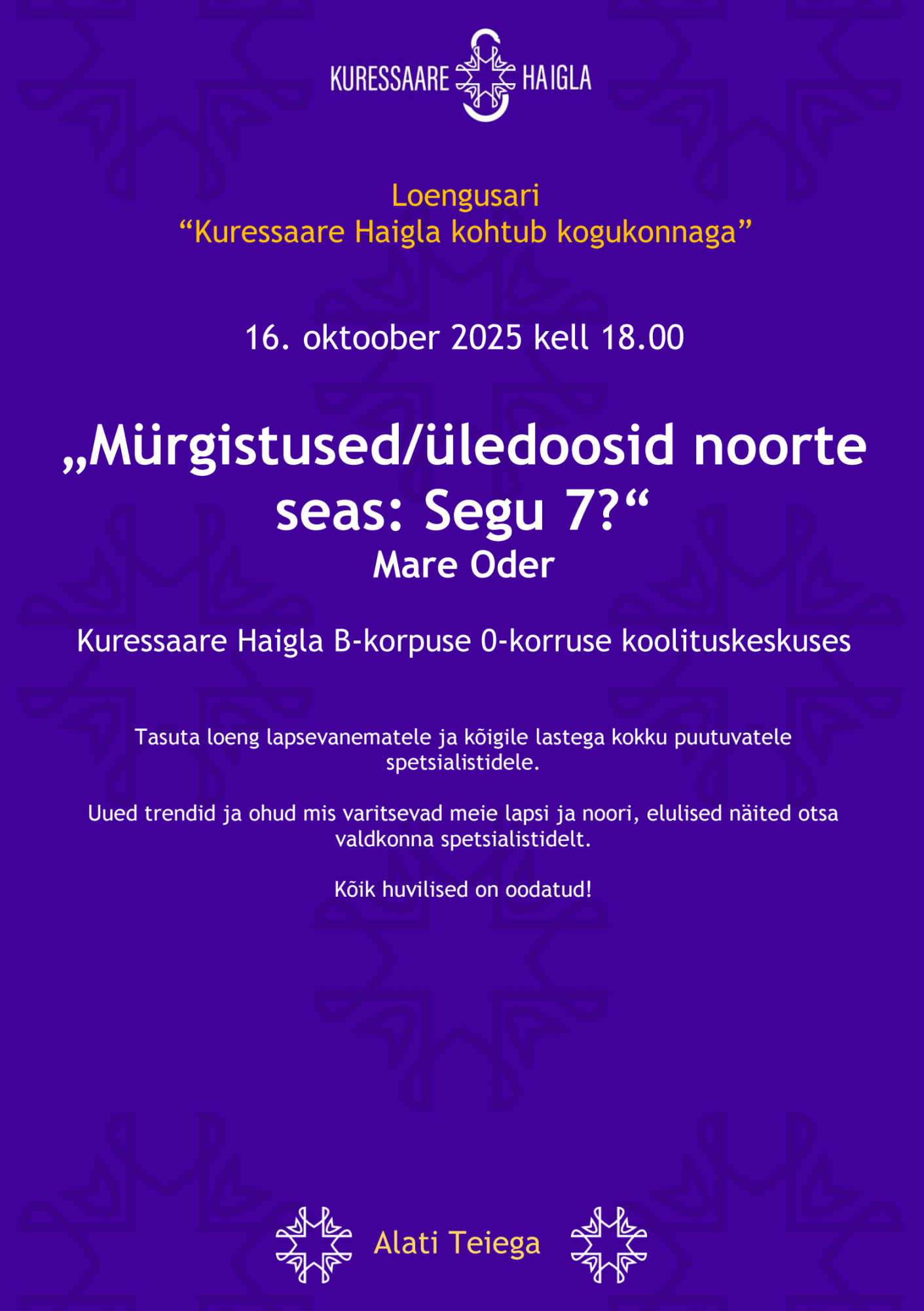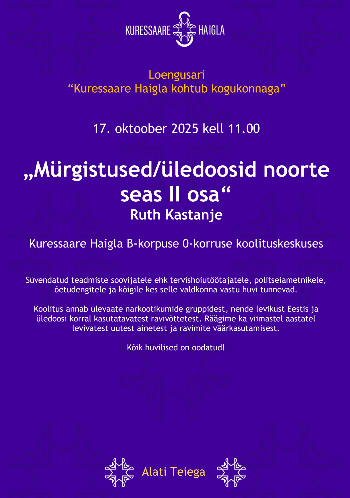 17.10 kell 11.00-14.00 Kuressaare Haigla koolituskeskuses (RUTH KASTANJE) loeng süvendatud teadmiste soovijatele ehk tervishoiutöötajatele, politseiametnikele, õetudengitele ja kõigile, kes selle valdkonna vastu huvi tunnevad.